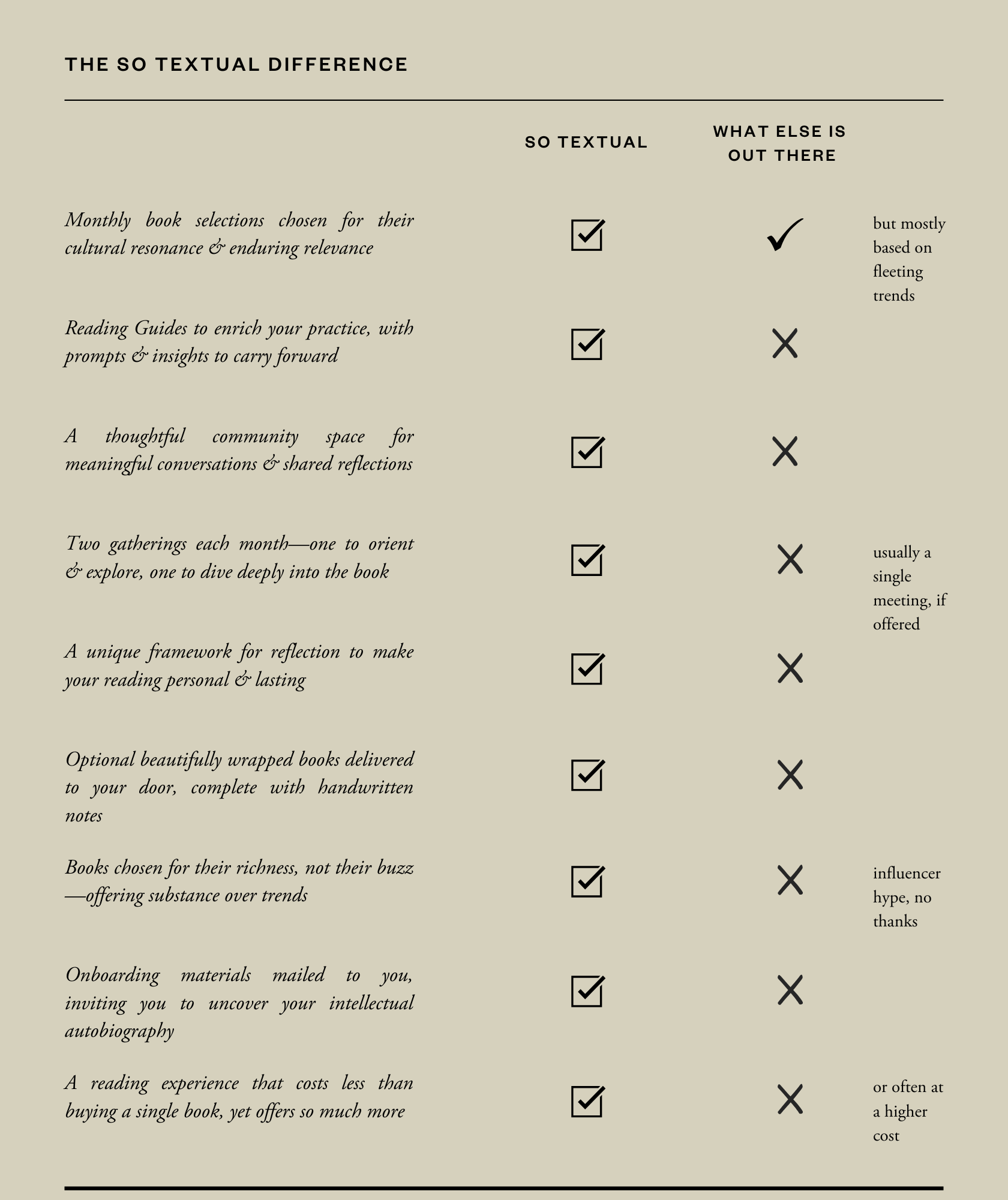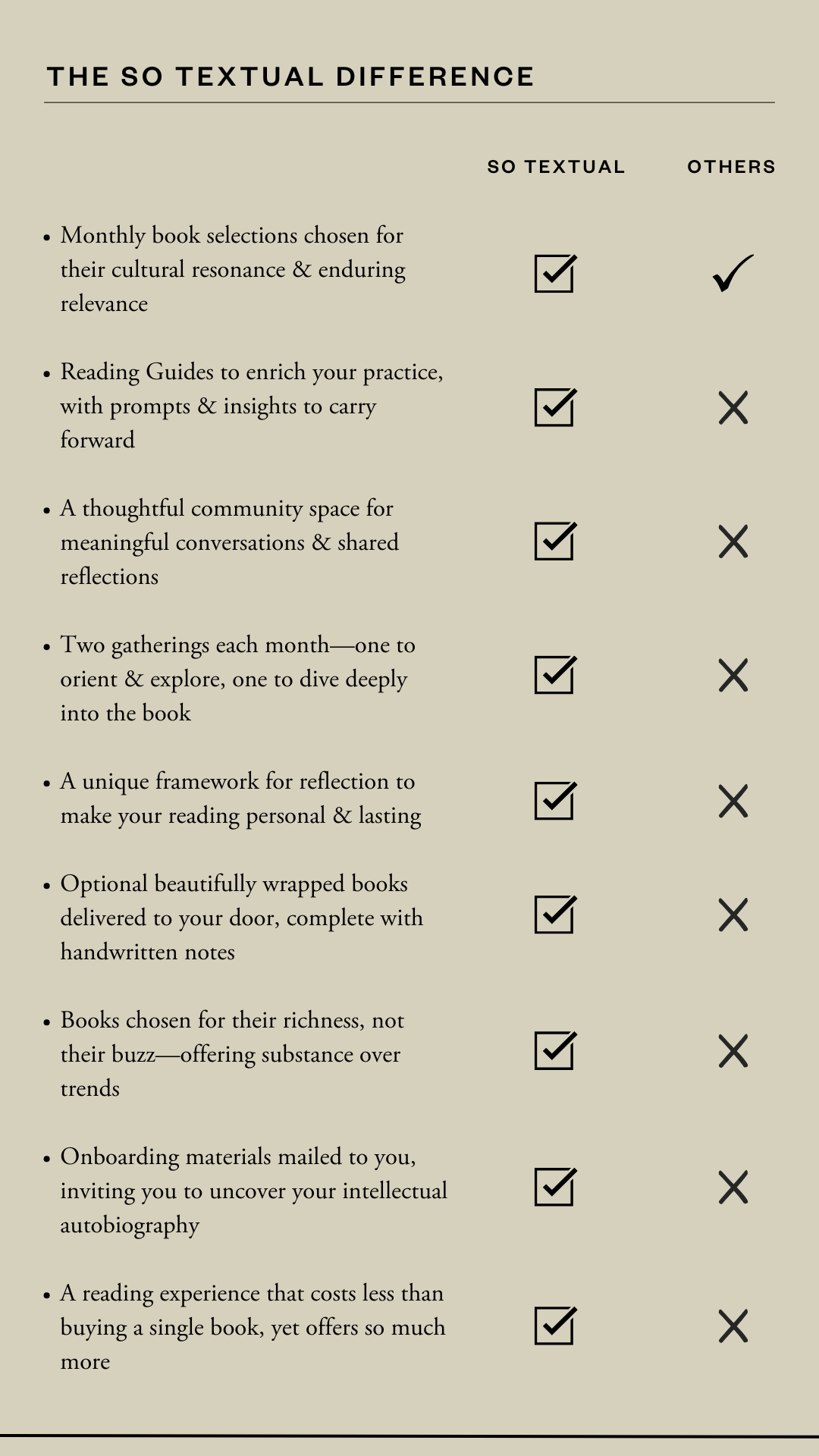 For less than the cost of a single book each month, So Textual gives you access to curated excellence, expert insights, and a vibrant community—all without adding stress to your life. Join today and cancel anytime, with a 30-day refund (Tier 1) if it’s not the perfect fit.